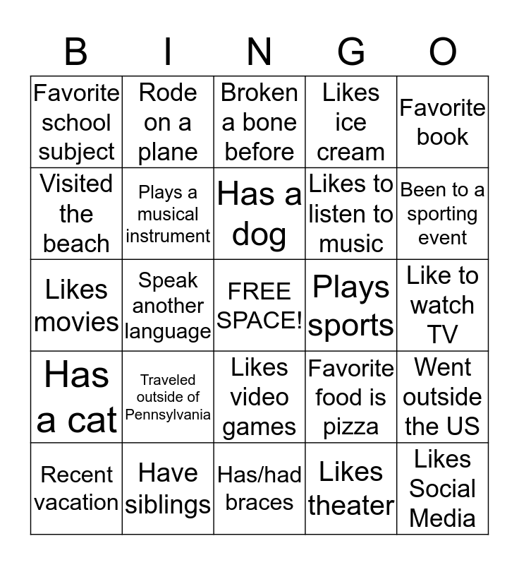 This bingo card has a free space and 24 words: Traveled outside of Pennsylvania, Have siblings, Has a dog, Recent vacation, Favorite book, Favorite school subject, Visited the beach, Rode on a plane, Plays sports, Likes video games, Likes to listen to music, Likes movies, Favorite food is pizza, Went outside the US, Plays a musical instrument, Likes theater, Like to watch TV, Broken a bone before, Been to a sporting event, Speak another language, Likes Social Media, Has a cat, Likes ice cream and Has/had braces.