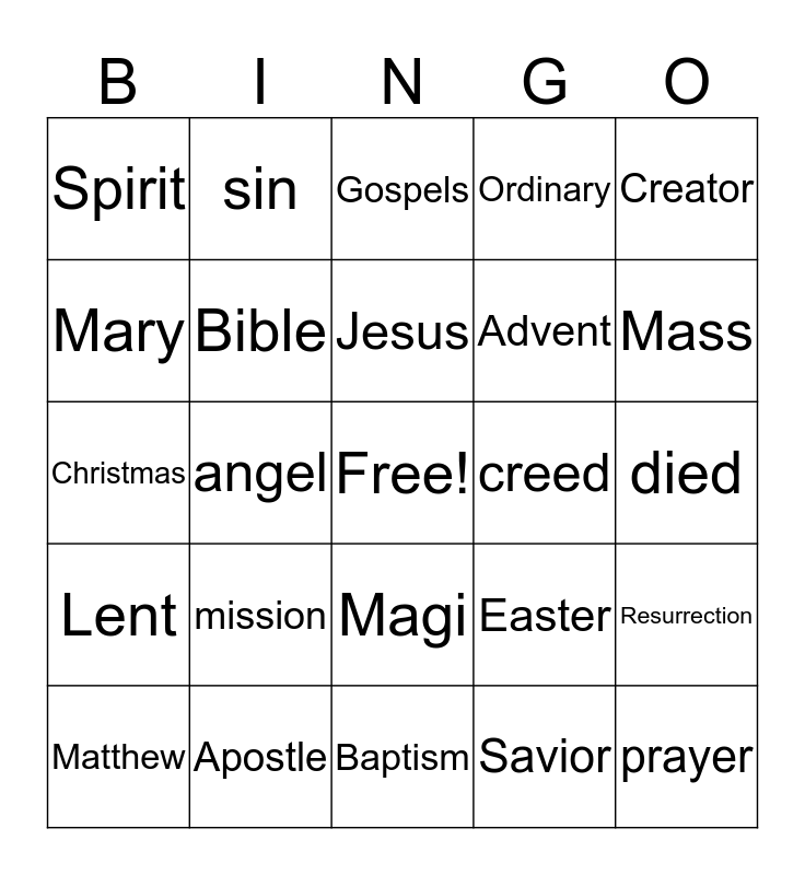 This bingo card has a free space and 24 words: mission, Apostle, Jesus, Matthew, Creator, Spirit, Mary, sin, creed, Magi, Advent, Christmas, Easter, Resurrection, Bible, Savior, died, Gospels, Mass, angel, prayer, Lent, Ordinary and Baptism.