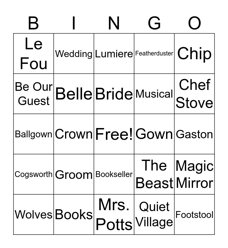 This bingo card has a free space and 41 words: Babette, Ballgown, Beauty, Belle, Books, Bookseller, Bride, Castle, Chip, Cogsworth, Crown, Featherduster, Footstool, Gaston, Gown, Groom, Happily Ever After, Le Fou, Library, Lumiere, Magic Mirror, Maurice, Mrs. Potts, Musical, Philippe, Prince Adam, Quiet Village, Rose, Chef Stove, Waltz, Wardrobe, Wedding, Wolves, The Enchantress, The Beast, Be Our Guest, Beauty & The Beast, Something There, The Bimbettes, Little Town and Chandeleria.