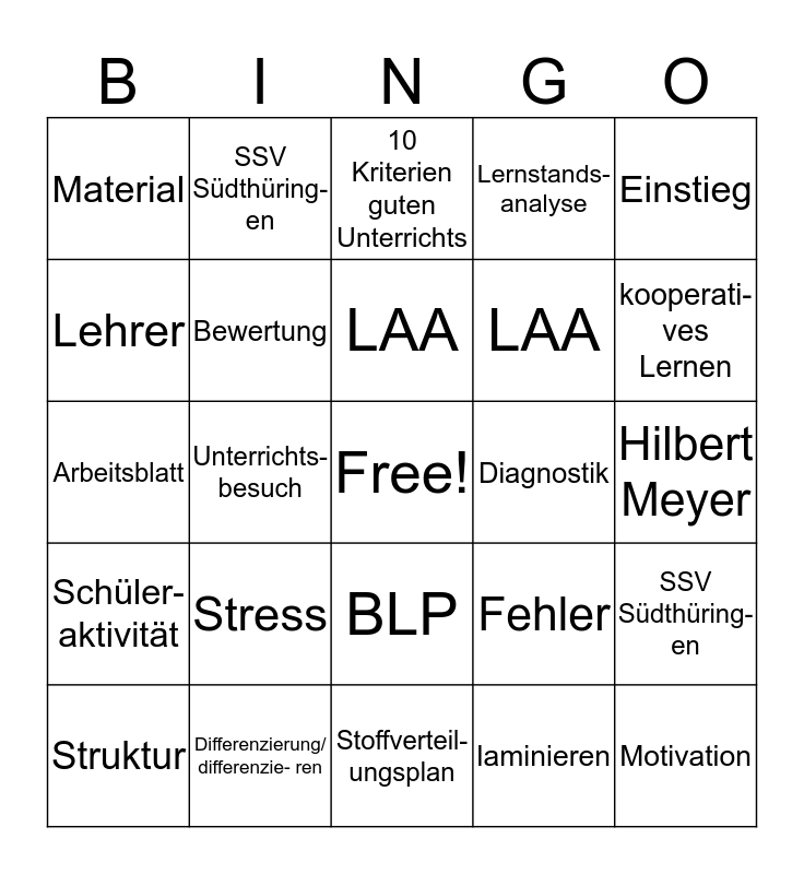 This bingo card has a free space and 24 words: Stress, Differenzierung/ differenzie- ren, LAA, Struktur, Einstieg, Material, Lehrer, SSV Südthüring- en, Diagnostik, BLP, LAA, Arbeitsblatt, Fehler, SSV Südthüring-en, Bewertung, laminieren, Hilbert Meyer, 10 Kriterien guten Unterrichts, kooperati- ves Lernen, Unterrichts-besuch, Motivation, Schüler- aktivität, Lernstands- analyse and Stoffverteil- ungsplan.