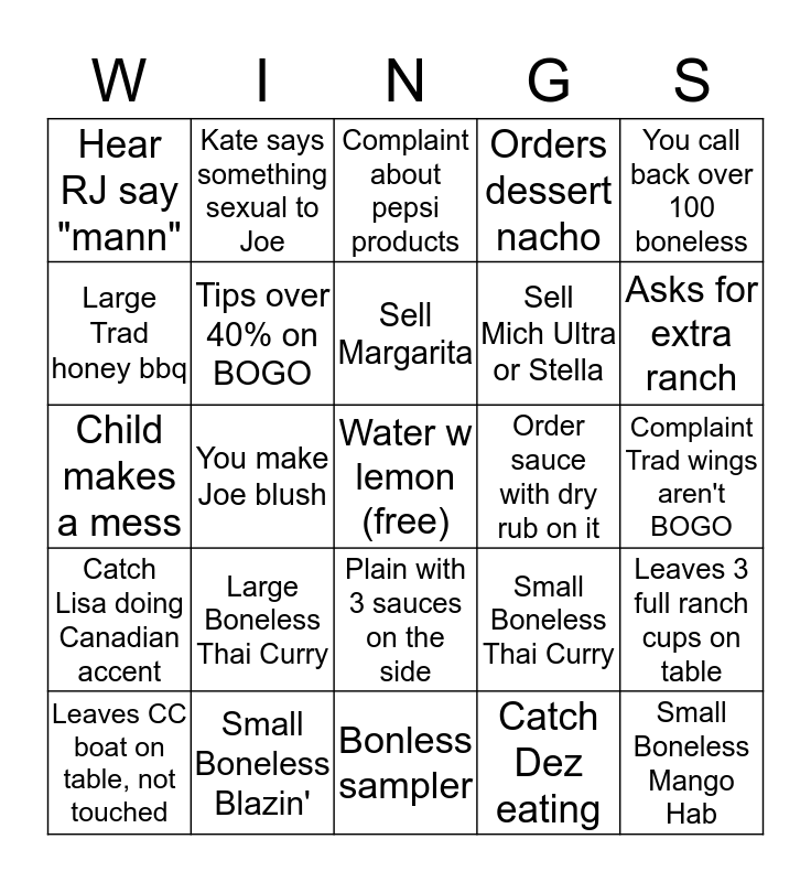 This bingo card has a free space and 24 words: Large Boneless Thai Curry, Small Boneless Blazin', Sell Margarita, Leaves CC boat on table, not touched, You call back over 100 boneless, Hear RJ say "mann", Large Trad honey bbq, Kate says something sexual to Joe, Order sauce with dry rub on it, Plain with 3 sauces on the side, Sell Mich Ultra or Stella, Child makes a mess, Small Boneless Thai Curry, Leaves 3 full ranch cups on table, Tips over 40% on BOGO, Catch Dez eating, Complaint Trad wings aren't BOGO, Complaint about pepsi products, Asks for extra ranch, You make Joe blush, Small Boneless Mango Hab, Catch Lisa doing Canadian accent, Orders dessert nacho and Bonless sampler.