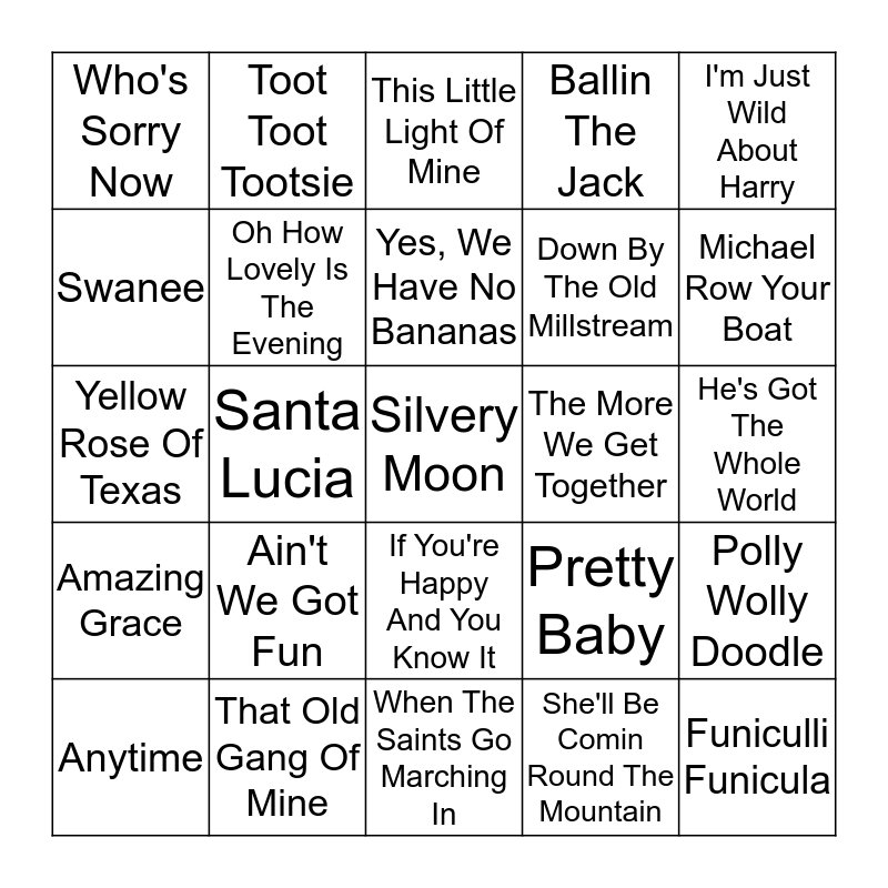 This bingo card has a free space and 24 words: Ain't We Got Fun, That Old Gang Of Mine, Yes, We Have No Bananas, Anytime, I'm Just Wild About Harry, Who's Sorry Now, Swanee, Toot Toot Tootsie, The More We Get Together, If You're Happy And You Know It, Down By The Old Millstream, Yellow Rose Of Texas, Pretty Baby, Polly Wolly Doodle, Oh How Lovely Is The Evening, She'll Be Comin Round The Mountain, He's Got The Whole World, This Little Light Of Mine, Michael Row Your Boat, Santa Lucia, Funiculli Funicula, Amazing Grace, Ballin The Jack and When The Saints Go Marching In.