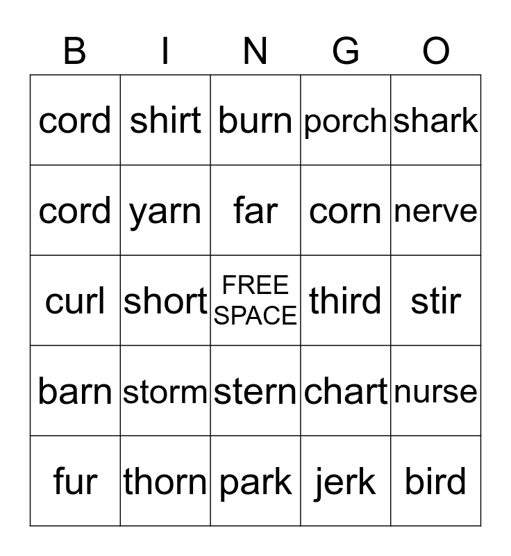 This bingo card has a free space and 24 words: storm, thorn, far, fur, shark, cord, cord, shirt, third, stern, corn, curl, chart, nurse, yarn, jerk, stir, burn, nerve, short, bird, barn, porch and park.