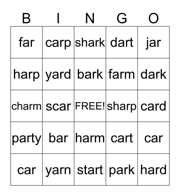 This bingo card has a free space and 24 words: bar, yarn, bark, car, jar, far, harp, carp, sharp, harm, farm, charm, cart, car, yard, park, card, shark, dark, scar, hard, party, dart and start.