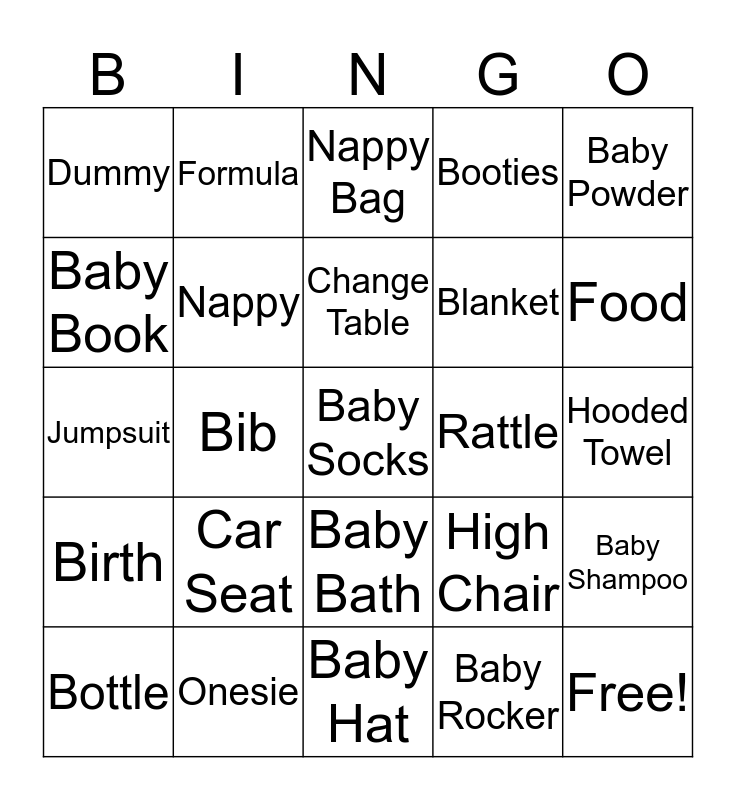 This bingo card has 33 words: Free!, Rubber Duck, Bib, Swing, Birth, Nappy, Baby Powder, Bottle, Formula, Cot, Change Table, Nappy Bag, Toy, Sterilizer, Rattle, Food, Onesie, Jumpsuit, Car Seat, High Chair, Baby Bath, Baby Wipes, Dummy, Hooded Towel, Baby Hat, Baby Socks, Booties, Blanket, Baby Book, Baby Shampoo, Burp Cloth, Baby Rocker and Bouncer.