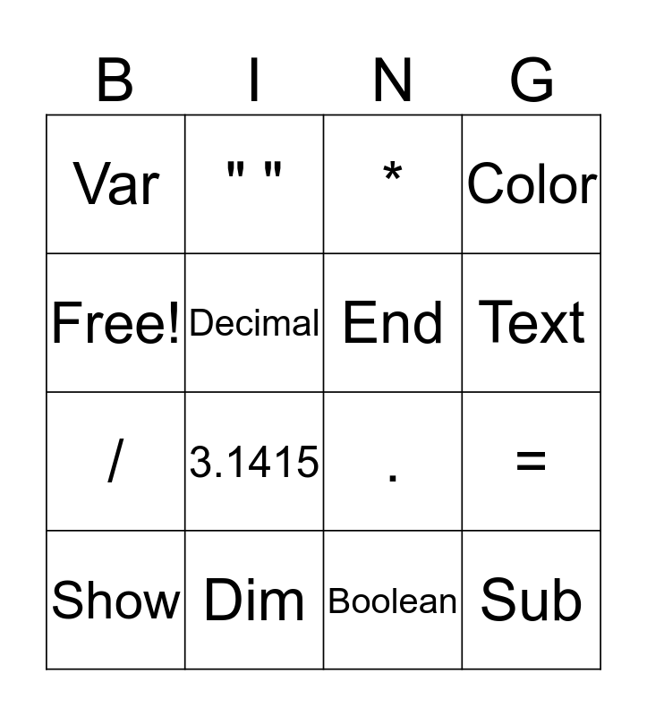 This bingo card has 16 words: Dim, =, *, Var, /, " ", ., Boolean, Free!, Decimal, Show, Color, 3.1415, Text, End and Sub.