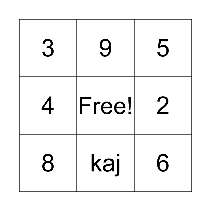 This bingo card has a free space and 9 words: 8, 5, 9, 4, 3, 2, 6, 7 and kaj.