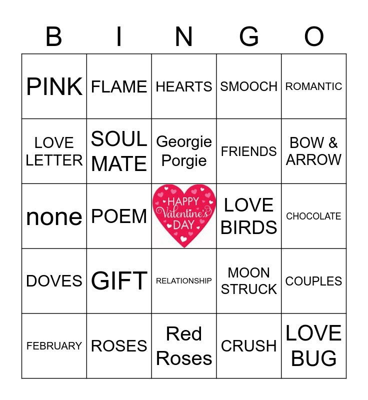 This bingo card has a free space and 70 words: HUGS, CHOCOLATE, CHAMPAGNE, SWEETHEARTS, ROSES, BE MINE, SMOOCH, ONLY YOU, ROMANTIC, CUPID, COUPLES, CANDLELIGHT, PINK, HEARTS, ALWAYS, POEM, RELATIONSHIP, FRIENDS, CARDS, DOVES, LOVE BIRDS, MOON STRUCK, BOW & ARROW, SLOW DANCE, RED, KISSES, LACE, HEART THROB, CRUSH, BALLOONS, FLAME, PERFUME, DINNER, HONEYMOON, LOVE, SHARE, CANDY, WINE, SWEET, LOVE LETTER, CUPCAKES, GIFT, LOVE BUG, CUDDLE, BELOVED, SOUL MATE, FEBRUARY, LOVE SICK, FOURTEENTH, RING, ENDLESS LOVE, ADDICTED TO LOVE, LOVE STORY, JEWERLY, Red Roses, Frog, Georgie Porgie, Pennsylvania, 1537, Teddy Roosevelt, none, Japan, Blind, Taj Mahal, Groundhog, Ancient Egypt, Horror, Youtube, Four and Al Capone.