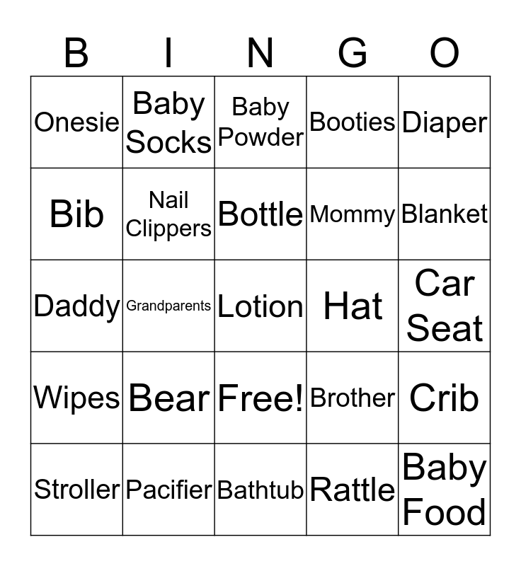 This bingo card has 26 words: Free!, Rattle, Bottle, Pacifier, Diaper, Onesie, Bib, Baby Socks, Car Seat, Brother, Mommy, Daddy, Crib, Stroller, Grandparents, High chair, Booties, Wipes, Baby Powder, Lotion, Blanket, Bathtub, Hat, Bear, Nail Clippers and Baby Food.