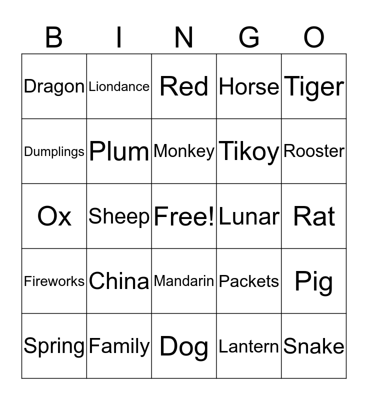 This bingo card has a free space and 25 words: China, Dog, Monkey, Spring, Tiger, Dragon, Dumplings, Liondance, Lunar, Mandarin, Tikoy, Ox, Packets, Pig, Plum, Rabbit, Rat, Red, Rooster, Sheep, Snake, Family, Fireworks, Horse and Lantern.