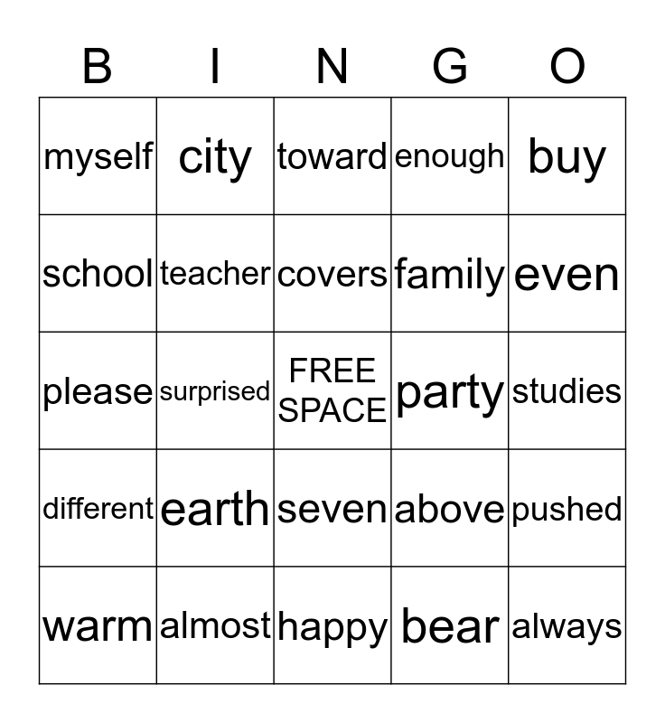 This bingo card has a free space and 24 words: earth, almost, covers, warm, buy, myself, school, city, party, seven, family, please, above, pushed, teacher, bear, studies, toward, even, surprised, always, different, enough and happy.