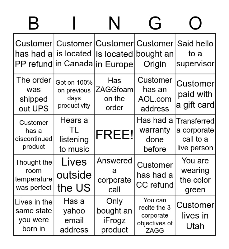 This bingo card has a free space and 24 words: Lives outside the US, Has a yahoo email address, Has ZAGGfoam on the order, Lives in the same state you were born in, Said hello to a supervisor, Customer has had a PP refund, The order was shipped out UPS, Customer is located in Canada, Has had a warranty done before, Answered a corporate call, Customer has an AOL.com address, Customer has a discontinued product, Customer has had a CC refund, You are wearing the color green, Got on 100% on previous days productivity, You can recite the 3 corporate objectives of ZAGG, Transferred a corporate call to a live person, Customer is located in Europe, Customer paid with a gift card, Hears a TL listening to music, Customer lives in Utah, Thought the room temperature was perfect, Customer bought an Origin and Only bought an iFrogz product.