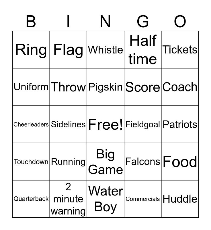 This bingo card has a free space and 28 words: Food, Football, Score, Commercials, Uniform, Whistle, Flag, Touchdown, Fieldgoal, Quarterback, Cheerleaders, Half time, 2 minute warning, Water Boy, Coach, Snap, Running, Throw, Pigskin, Big Game, Ring, Disneyworld, Huddle, Sidelines, Patriots, Falcons, Tickets and Half Time Show.
