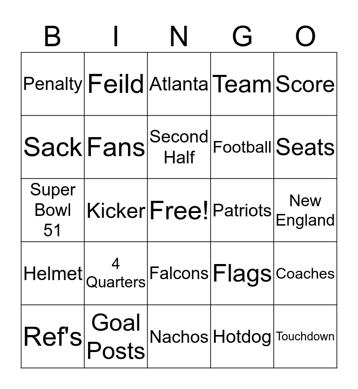 This bingo card has a free space and 24 words: 4 Quarters, Goal Posts, Second Half, Ref's, Score, Penalty, Sack, Feild, Patriots, Falcons, Football, Super Bowl 51, Flags, Coaches, Fans, Hotdog, New England, Atlanta, Seats, Kicker, Touchdown, Helmet, Team and Nachos.