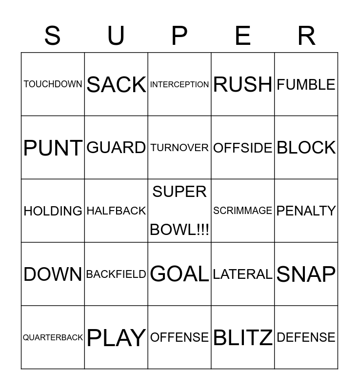 This bingo card has a free space and 29 words: QUARTERBACK, FULLBACK, HALFBACK, RECEIVER, TOUCHDOWN, INTERCEPTION, GUARD, BACKFIELD, SCRIMMAGE, PLAY, PENALTY, DEFENSE, OFFENSE, BLITZ, BLOCK, TACKLE, GOAL, DOWN, FUMBLE, HOLDING, LATERAL, LINEMEN, OFFSIDE, PUNT, RUSH, SACK, SNAP, TURNOVER and KICKER.