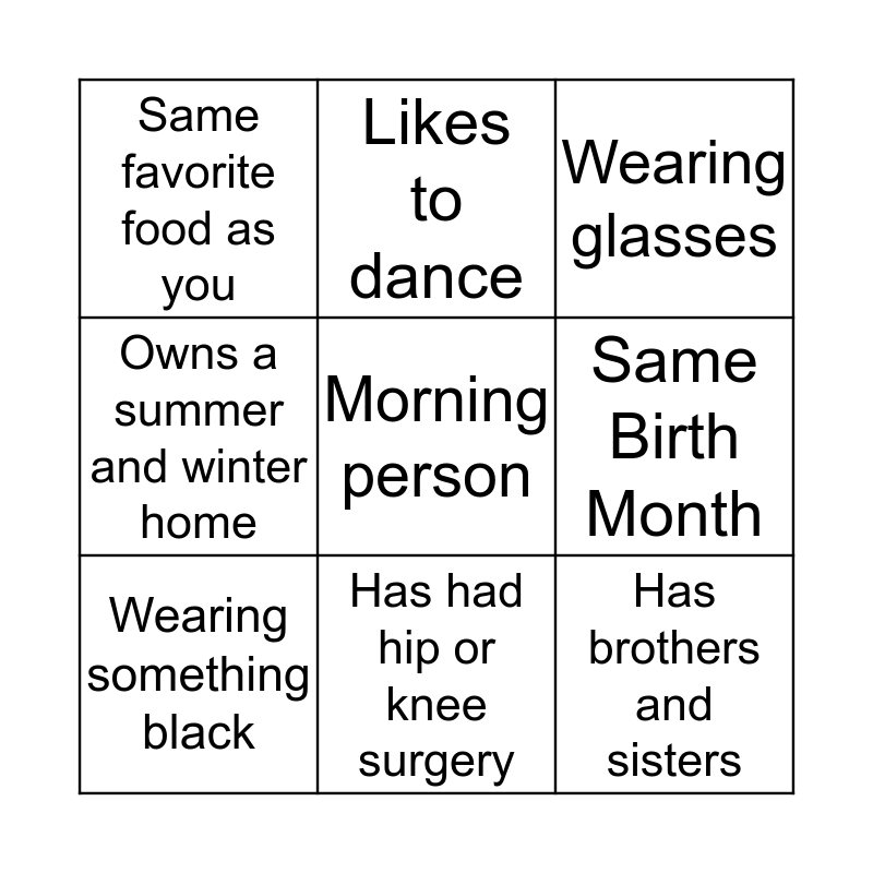 This bingo card has a free space and 8 words: Same Birth Month, Wearing glasses, Likes to dance, Wearing something black, Same favorite food as you, Has brothers and sisters, Owns a summer and winter home and Has had hip or knee surgery.