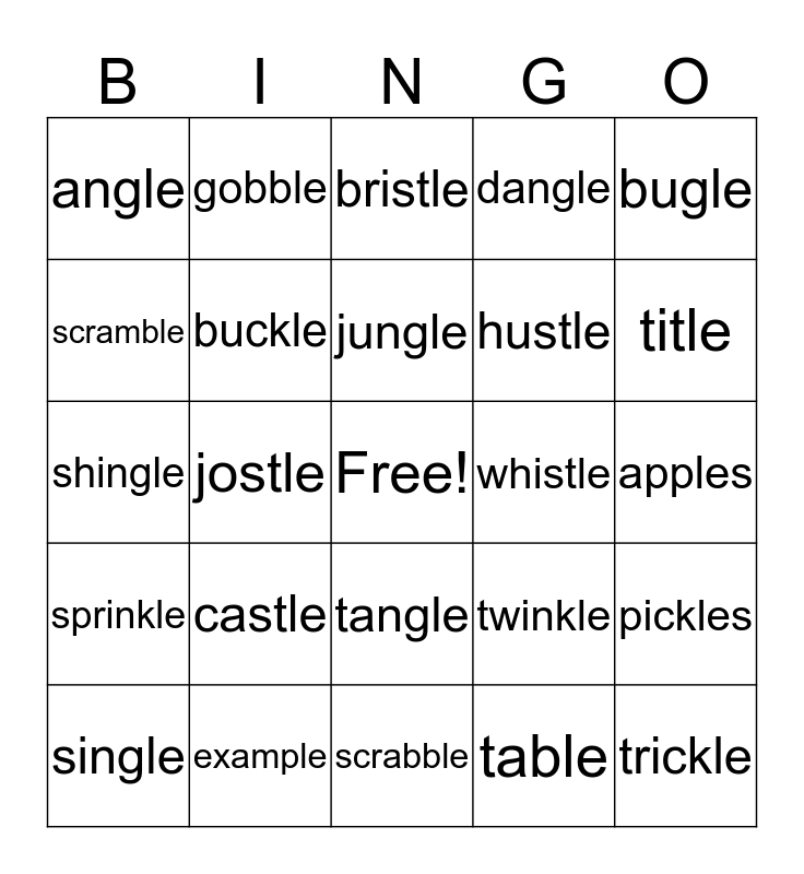 This bingo card has a free space and 24 words: castle, example, jungle, single, bugle, angle, scramble, gobble, whistle, tangle, hustle, shingle, twinkle, pickles, buckle, table, apples, bristle, title, jostle, trickle, sprinkle, dangle and scrabble.