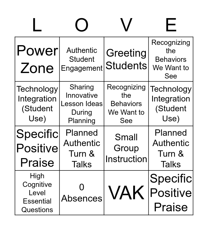 ⚠ This card has duplicate items: Planned Authentic Turn & Talks (2), Specific Positive Praise (2), Technology Integration (Student Use) (2), Recognizing the Behaviors We Want to See (2)