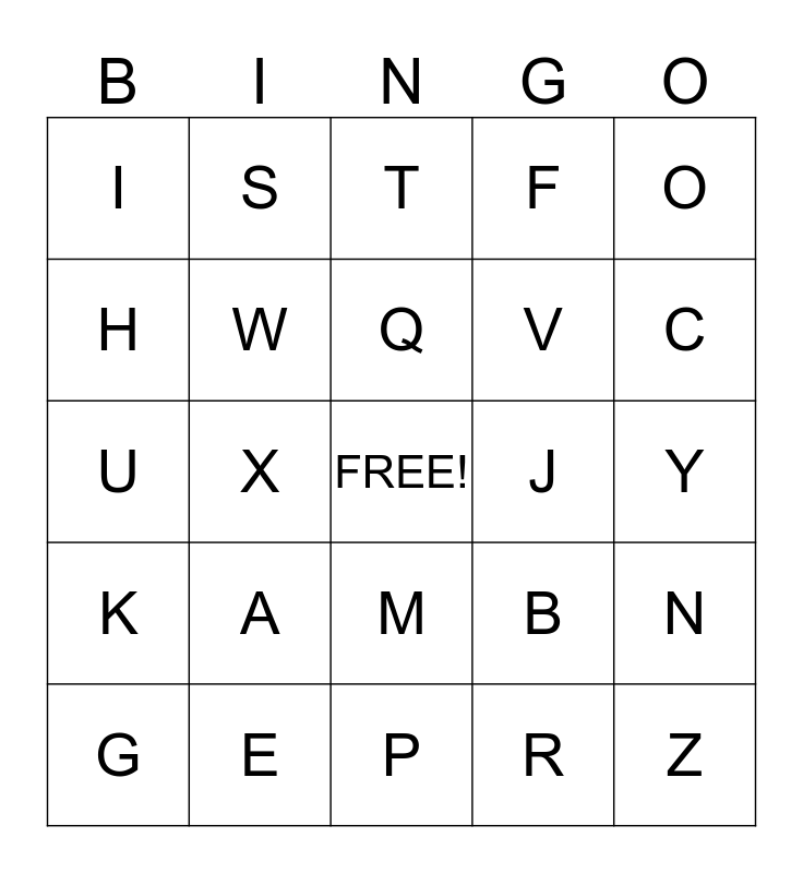 This bingo card has a free space and 24 words: A, E, Q, G, O, I, H, S, J, M, V, U, B, N, W, R, Y, T, C, X, Z, K, F and P.