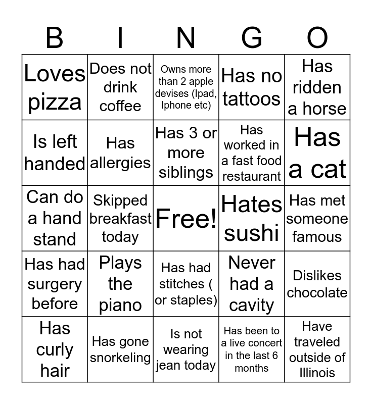This bingo card has a free space and 24 words: Plays the piano, Has gone snorkeling, Has 3 or more siblings, Has curly hair, Has ridden a horse, Loves pizza, Is left handed, Does not drink coffee, Hates sushi, Has had stitches ( or staples), Has worked in a fast food restaurant, Can do a hand stand, Never had a cavity, Dislikes chocolate, Has allergies, Has been to a live concert in the last 6 months, Has met someone famous, Owns more than 2 apple devises (Ipad, Iphone etc), Has a cat, Skipped breakfast today, Have traveled outside of Illinois, Has had surgery before, Has no tattoos and Is not wearing jean today.