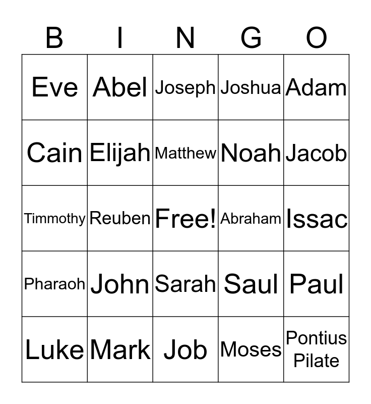 This bingo card has a free space and 24 words: John, Mark, Matthew, Luke, Adam, Eve, Cain, Abel, Abraham, Sarah, Noah, Timmothy, Saul, Paul, Elijah, Moses, Issac, Joseph, Jacob, Reuben, Pontius Pilate, Pharaoh, Joshua and Job.