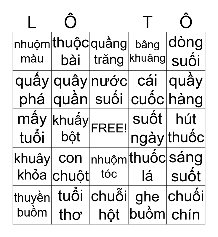 This bingo card has a free space and 24 words: con chuột, tuổi thơ, nước suối, thuyền buồm, dòng suối, nhuộm màu, quấy phá, thuộc bài, suốt ngày, nhuộm tóc, cái cuốc, mấy tuổi, thuốc lá, sáng suốt, quây quần, ghe buồm, hút thuốc, quầng trăng, quầy hàng, khuấy bột, chuối chín, khuây khỏa, bâng khuâng and chuỗi hột.