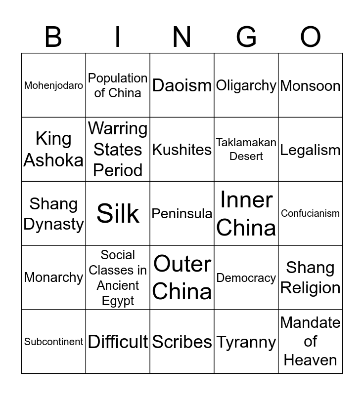 This bingo card has 25 words: Social Classes in Ancient Egypt, Scribes, Kushites, Subcontinent, Monsoon, Mohenjodaro, King Ashoka, Population of China, Inner China, Outer China, Taklamakan Desert, Shang Dynasty, Democracy, Shang Religion, Warring States Period, Mandate of Heaven, Confucianism, Daoism, Legalism, Silk, Peninsula, Difficult, Monarchy, Oligarchy and Tyranny.