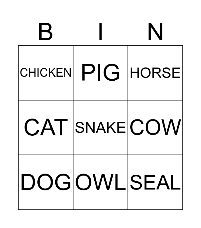 This bingo card has a free space and 8 words: COW, HORSE, PIG, DOG, CHICKEN, SEAL, CAT and OWL.