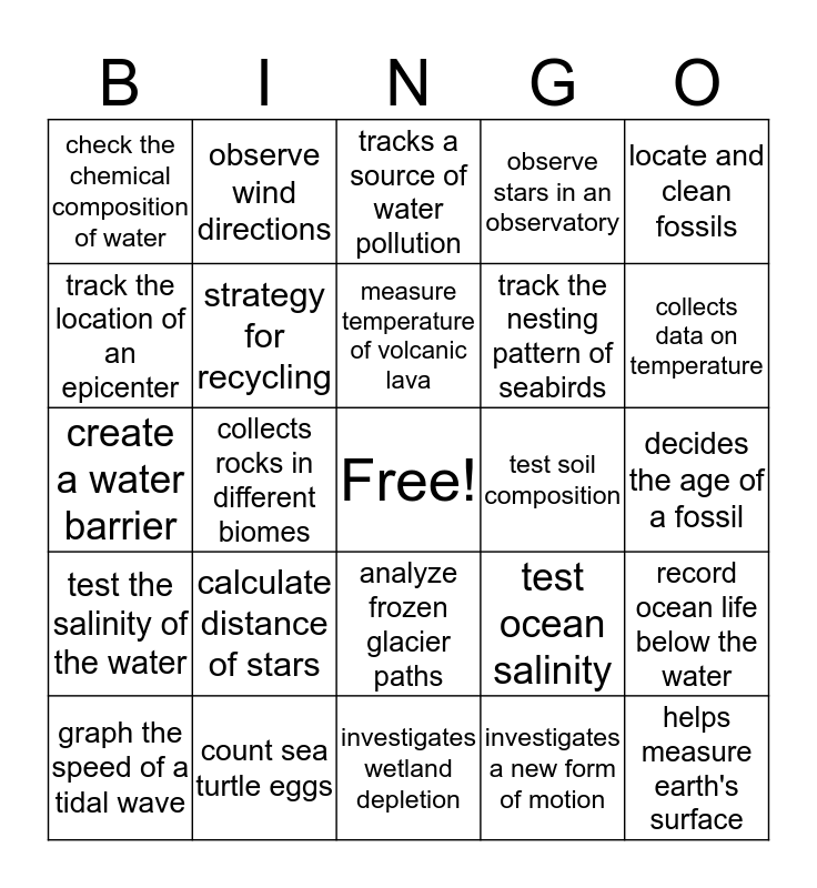 This bingo card has a free space and 24 words: calculate distance of stars, count sea turtle eggs, measure temperature of volcanic lava, graph the speed of a tidal wave, locate and clean fossils, check the chemical composition of water, track the location of an epicenter, observe wind directions, test soil composition, analyze frozen glacier paths, track the nesting pattern of seabirds, create a water barrier, test ocean salinity, record ocean life below the water, strategy for recycling, investigates a new form of motion, decides the age of a fossil, tracks a source of water pollution, collects data on temperature, collects rocks in different biomes, helps measure earth's surface, test the salinity of the water, observe stars in an observatory and investigates wetland depletion.