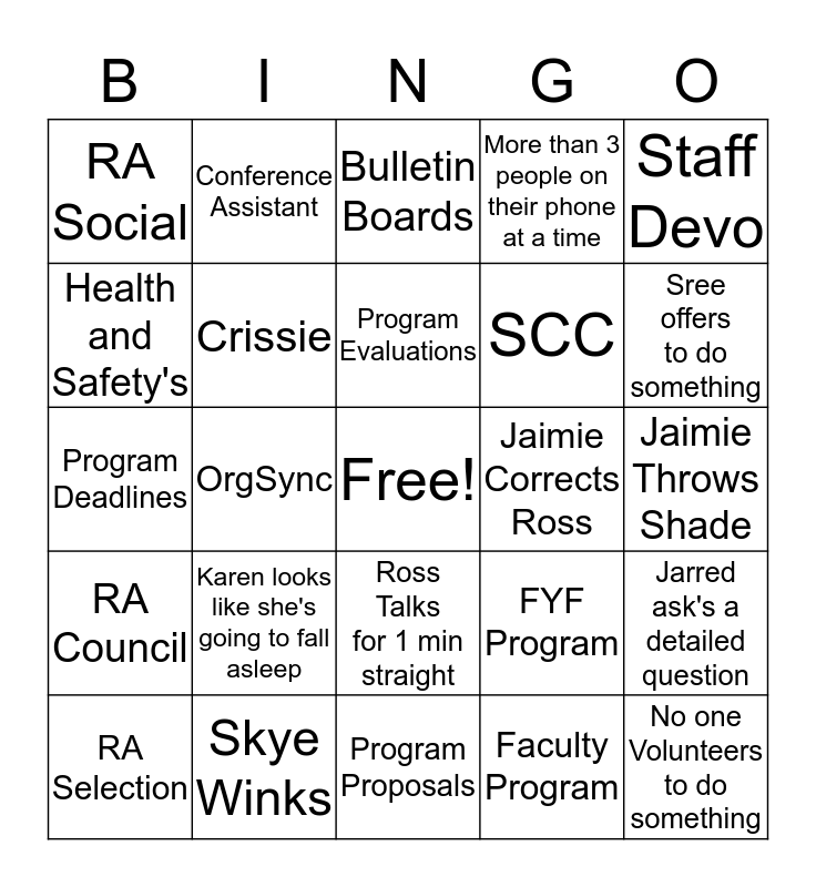 This bingo card has a free space and 24 words: Karen looks like she's going to fall asleep, Skye Winks, Program Evaluations, RA Selection, Staff Devo, RA Social, Health and Safety's, Conference Assistant, Jaimie Corrects Ross, Ross Talks for 1 min straight, SCC, Program Deadlines, FYF Program, Jarred ask's a detailed question, Crissie, Faculty Program, Jaimie Throws Shade, Bulletin Boards, Sree offers to do something, OrgSync, No one Volunteers to do something, RA Council, More than 3 people on their phone at a time and Program Proposals.