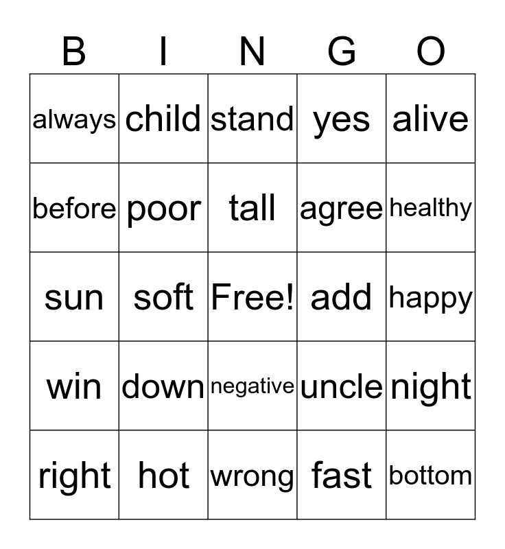 This bingo card has a free space and 24 words: down, hot, tall, right, alive, always, before, child, add, negative, agree, sun, uncle, night, poor, fast, happy, stand, healthy, soft, bottom, win, yes and wrong.