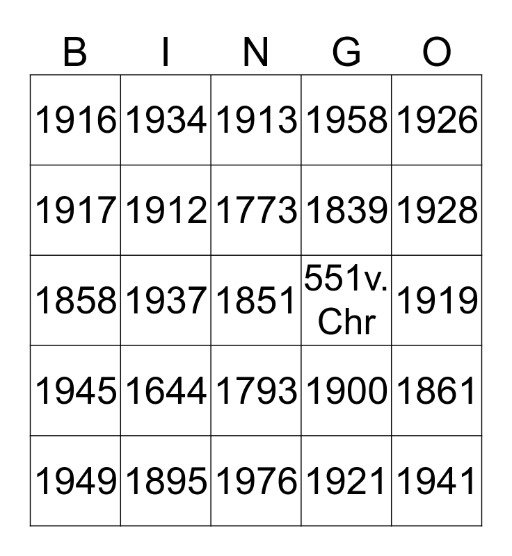 This bingo card has a free space and 24 words: 1644, 1895, 1773, 1949, 1926, 1916, 1917, 1934, 551v. Chr, 1793, 1839, 1858, 1900, 1861, 1912, 1921, 1919, 1913, 1928, 1937, 1941, 1945, 1958 and 1976.