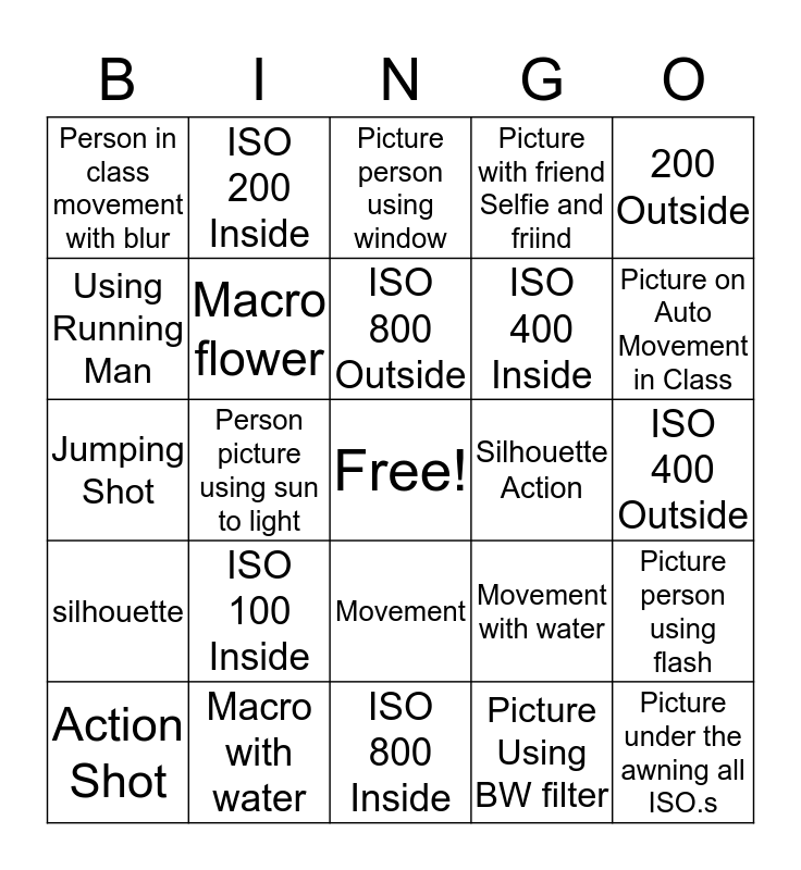 This bingo card has a free space and 24 words: ISO 100 Inside, Macro with water, ISO 800 Outside, Action Shot, 200 Outside, Person in class movement with blur, Using Running Man, ISO 200 Inside, Silhouette Action, Movement, ISO 400 Inside, Jumping Shot, Movement with water, Picture person using flash, Macro flower, Picture Using BW filter, ISO 400 Outside, Picture person using window, Picture on Auto Movement in Class, Person picture using sun to light, Picture under the awning all ISO.s, silhouette, Picture with friend Selfie and friind and ISO 800 Inside.