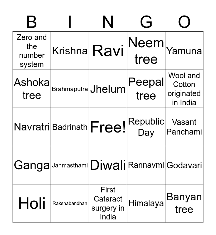 This bingo card has a free space and 32 words: Himalaya, Aravalli, Badrinath, Kedarnath, Ganga, Brahmaputra, Yamuna, Godavari, Krishna, Narmada, Jhelum, Ravi, Indus, Sutlej, Republic Day, Independence Day, Holi, Navratri, Diwali, Janmasthami, Rannavmi, Sharad Poonam, Vasant Panchami, Rakshabandhan, Banyan tree, Neem tree, Peepal tree, Ashoka tree, Zero and the number system, First Cataract surgery in India, Diamonds First manufactured in India and Wool and Cotton originated in India.