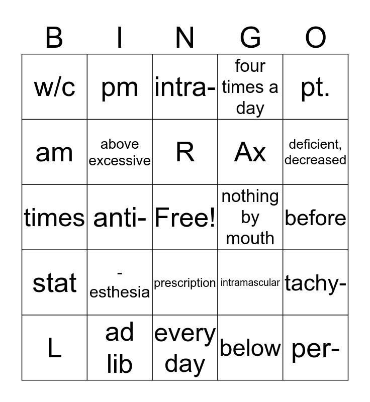 This bingo card has a free space and 24 words: -esthesia, ad lib, R, L, pt., w/c, am, pm, nothing by mouth, prescription, Ax, times, intramascular, tachy-, above excessive, below, before, intra-, deficient, decreased, anti-, per-, stat, four times a day and every day.