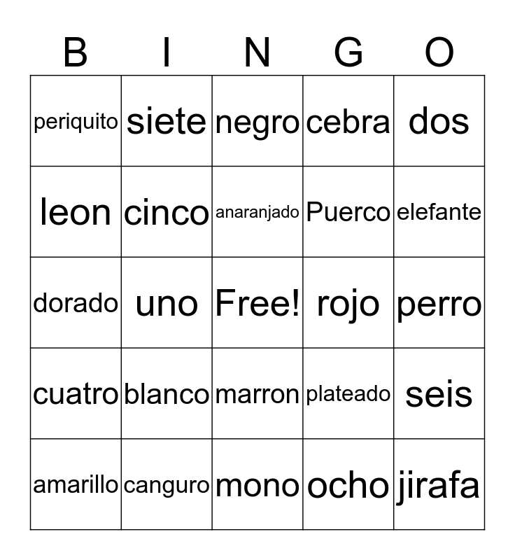 This bingo card has a free space and 32 words: ocho, amigo, uno, diez, cuatro, cinco, dos, seis, siete, nueve, anaranjado, negro, azul, verde, rojo, morado, amarillo, dorado, marron, blanco, plateado, gato, perro, canguro, jirafa, cebra, Puerco, leon, periquito, mono, tigre and elefante.