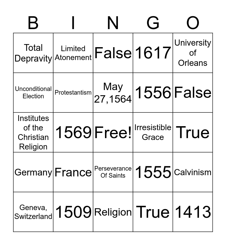 This bingo card has a free space and 24 words: France, 1509, May 27,1564, Geneva, Switzerland, University of Orleans, Total Depravity, Unconditional Election, Limited Atonement, Irresistible Grace, Perseverance Of Saints, 1556, Institutes of the Christian Religion, 1555, Calvinism, Protestantism, True, True, False, False, 1569, 1413, Germany, 1617 and Religion.
