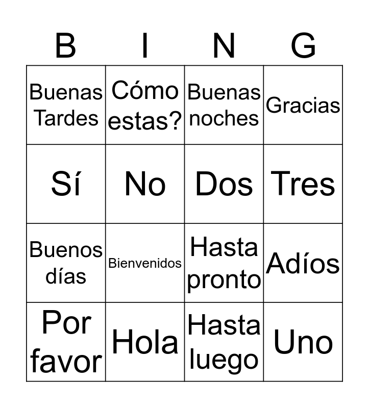 This bingo card has 16 words: Hola, Adíos, Buenas noches, Buenas Tardes, Buenos días, Cómo estas?, Hasta pronto, Hasta luego, Sí, No, Por favor, Gracias, Bienvenidos, Tres, Dos and Uno.