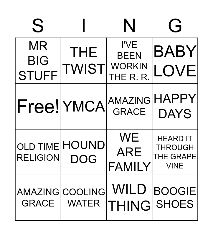 This bingo card has 16 words: COOLING WATER, HEARD IT THROUGH THE GRAPE VINE, I'VE BEEN WORKIN THE R. R., MR BIG STUFF, OLD TIME RELIGION, THE TWIST, WE ARE FAMILY, WILD THING, Free!, YMCA, AMAZING GRACE, BABY LOVE, HOUND DOG, HAPPY DAYS, AMAZING GRACE and BOOGIE SHOES.