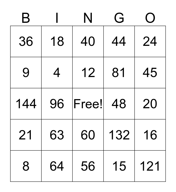 This bingo card has a free space and 24 words: 63, 64, 12, 8, 24, 36, 9, 18, 48, 60, 81, 144, 132, 16, 4, 15, 20, 40, 45, 96, 121, 21, 44 and 56.