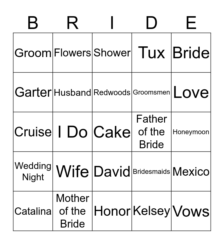 This bingo card has 26 words: David, Kelsey, Redwoods, Mother of the Bride, Bride, Groom, Garter, Flowers, Honeymoon, Bridesmaids, Groomsmen, Cruise, Mexico, Catalina, I Do, Dress, Tux, Wedding Night, Shower, Cake, Love, Honor, Father of the Bride, Wife, Husband and Vows.