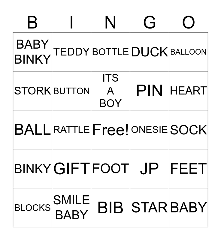 This bingo card has a free space and 24 words: GIFT, SMILE BABY, ITS A BOY, BLOCKS, BALLOON, BABY BINKY, STORK, TEDDY, ONESIE, FOOT, PIN, BALL, JP, FEET, BUTTON, STAR, SOCK, BOTTLE, HEART, RATTLE, BABY, BINKY, DUCK and BIB.