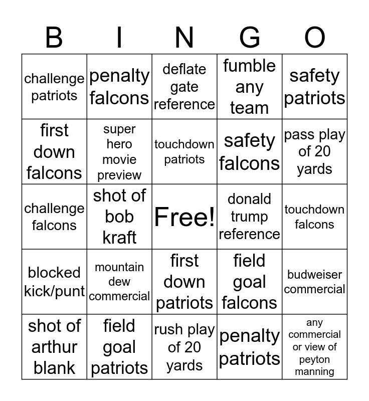 This bingo card has a free space and 26 words: first down patriots, penalty patriots, touchdown patriots, field goal patriots, safety patriots, challenge patriots, first down falcons, penalty falcons, touchdown falcons, field goal falcons, safety falcons, challenge falcons, budweiser commercial, shot of arthur blank, shot of bob kraft, interception any team, fumble any team, blocked kick/punt, deflate gate reference, any commercial or view of peyton manning, pass play of 20 yards, rush play of 20 yards, donald trump reference, mountain dew commercial, super hero movie preview and candy commercial.