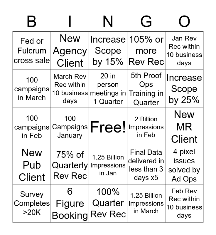 This bingo card has a free space and 24 words: 75% of Quarterly Rev Rec, 6 Figure Booking, 20 in person meetings in 1 Quarter, Survey Completes >20K, Jan Rev Rec within 10 business days, Fed or Fulcrum cross sale, 100 campaigns in March, New Agency Client, 2 Billion Impressions in Feb, 1.25 Billion Impressions in Jan, 5th Proof Ops Training in Quarter, 100 campaigns in Feb, Final Data delivered in less than 3 days x5, 4 pixel issues solved by Ad Ops, March Rev Rec within 10 business days, 1.25 Billion Impressions in March, New MR Client, Increase Scope by 15%, Increase Scope by 25%, 100 Campaigns January, Feb Rev Rec within 10 business days, New Pub Client, 105% or more Rev Rec and 100% Quarter Rev Rec.