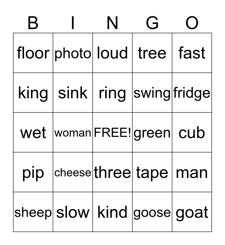 This bingo card has a free space and 43 words: cow, goat, horse, sheep, donkey, goose, loud, quiet, fast, slow, tree, green, three, cheese, feet, kind, naughty, wet, dry, fridge, photo, tidy, untidy, floor, rubbish, cub, cube, tap, tape, pip, pipe, man, men, woman, women, child, children, ring, king, swing, bank, sink and pink.