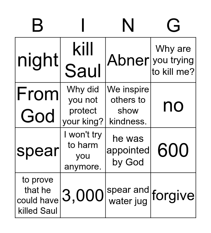 This bingo card has 16 words: 3,000, 600, Abner, night, spear, kill Saul, he was appointed by God, spear and water jug, From God, Why did you not protect your king?, to prove that he could have killed Saul, Why are you trying to kill me?, I won't try to harm you anymore., no, We inspire others to show kindness. and forgive.