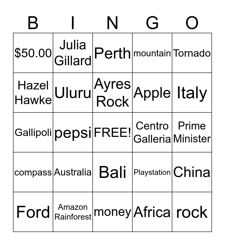 This bingo card has a free space and 24 words: Australia, Amazon Rainforest, Ayres Rock, Ford, Tornado, $50.00, Hazel Hawke, Julia Gillard, Centro Galleria, Bali, Apple, Gallipoli, Playstation, China, Uluru, Africa, Prime Minister, Perth, Italy, pepsi, rock, compass, mountain and money.
