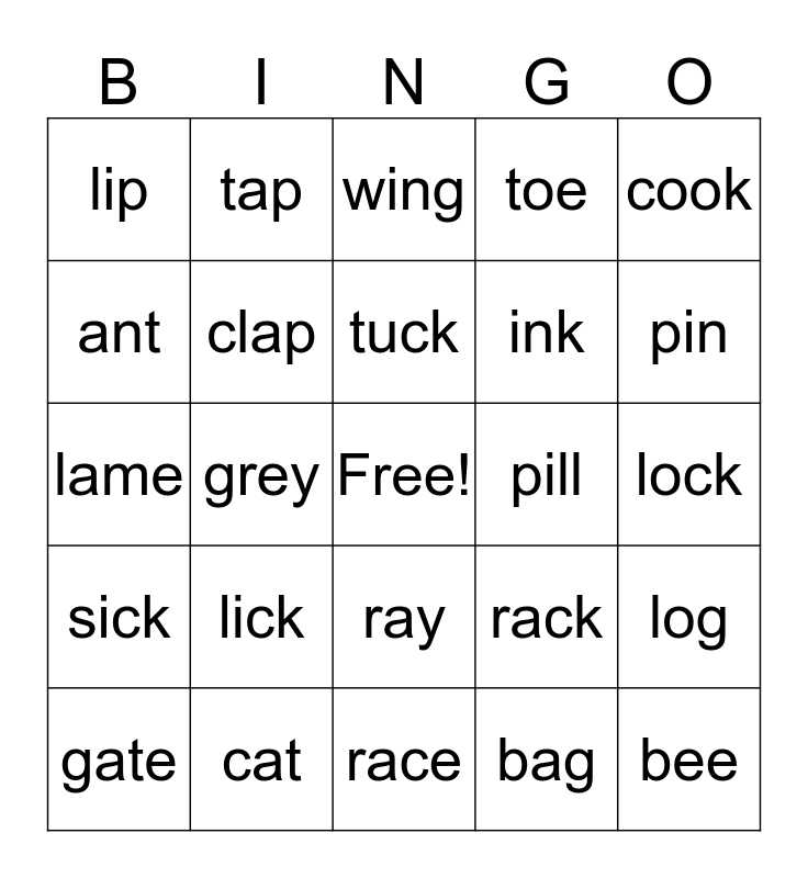 This bingo card has a free space and 34 words: we, bag, lip, bad, sick, clap, cook, gate, tap, back, tuck, wing, low, rate, pill, pin, cat, lame, lick, rack, ray, raft, lip, lock, race, bee, toe, to, ink, ant, rain, grey, log and bar.