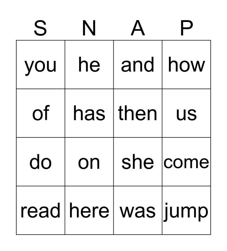This bingo card has 16 words: here, come, and, you, do, he, she, was, of, has, read, how, on, us, then and jump.