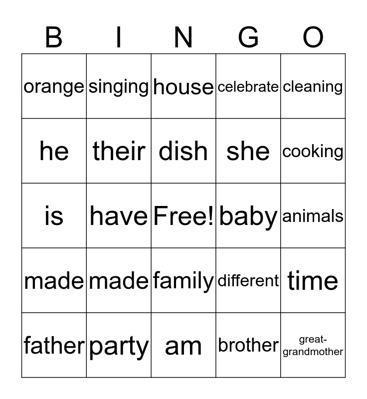 This bingo card has a free space and 45 words: grandmother, great-grandmother, mother, father, sister, brother, house, eating, cleaning, party, celebrate, baby, family, made, food, am, are, is, the, cooking, singing, reading, Boris, orange, tiger, animals, parrot, but, different, made, same, time, was, were, has, have, little, big, want, dish, he, she, they, their and my.